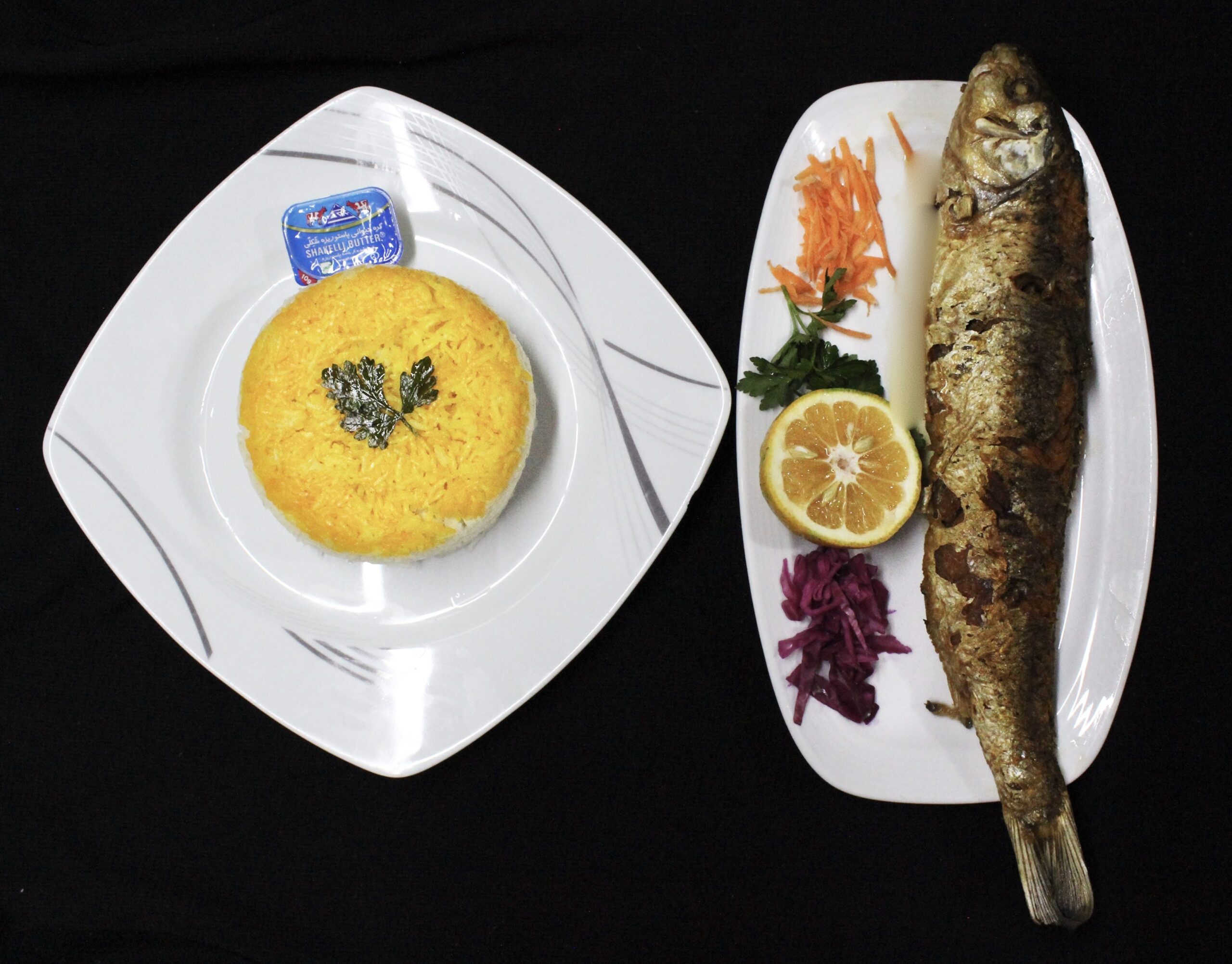 یک عدد ماهی کفال 600 گرمی،یک پرس برنج درجه یک گیلانی،دورچین
